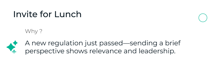 As a fractional executive, your reputation depends on the relationships you build across multiple engagements. BD4 keeps you top-of-mind with every client and prospect, prompting the right outreach at the right time so opportunities come to you while you stay focused on delivering.