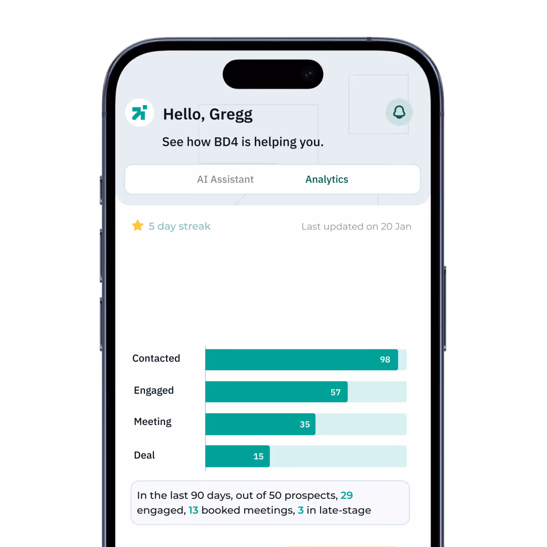 Legal work demands precision, and so do the relationships that drive your practice. BD4 ensures every interaction with prospects builds the trust and credibility that lead to referrals and repeat business, without adding hours to your week.